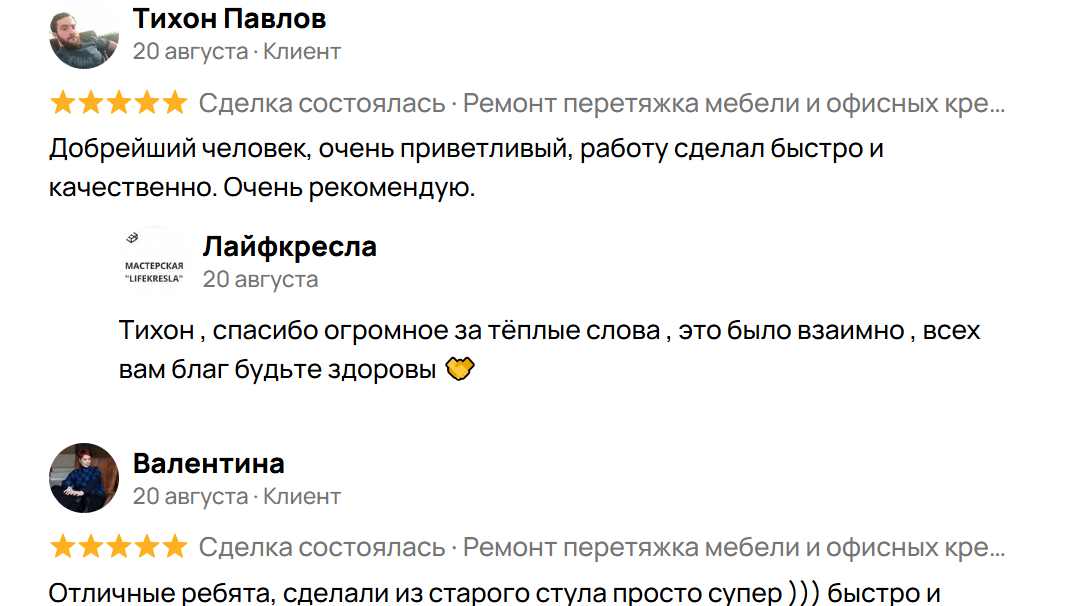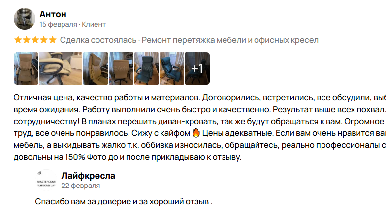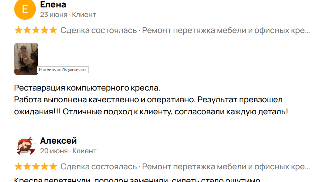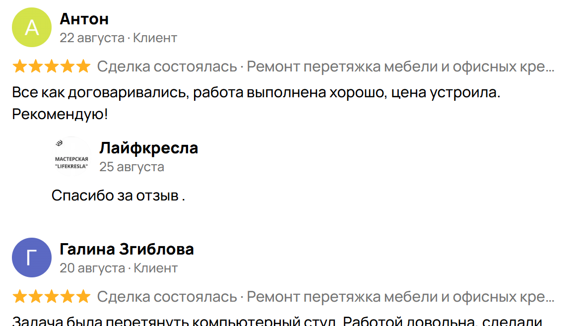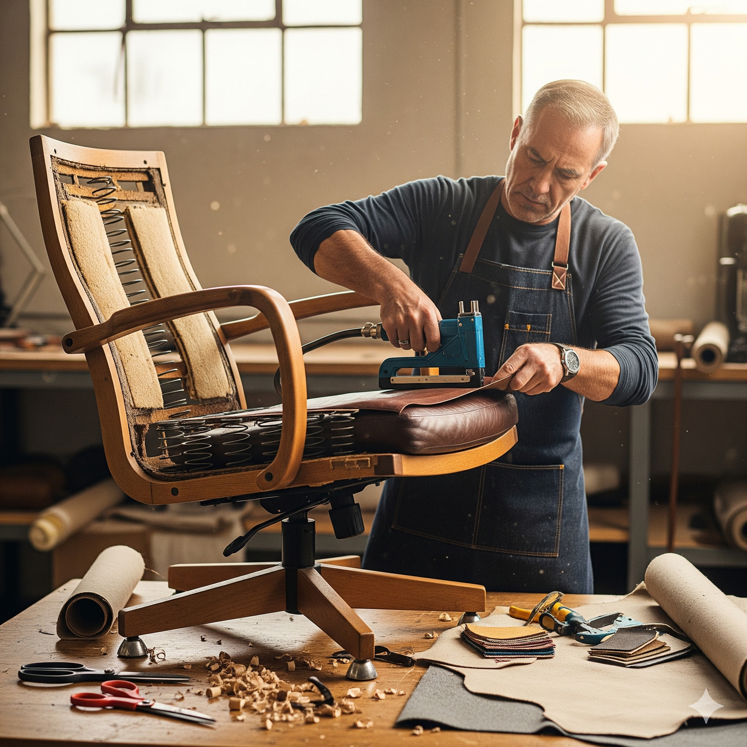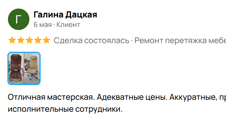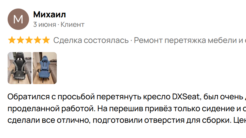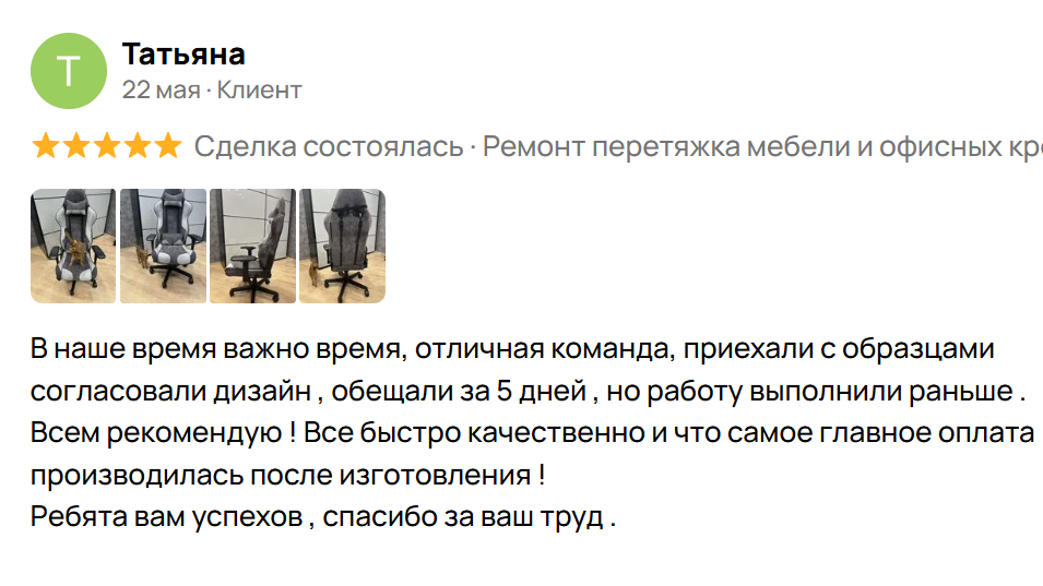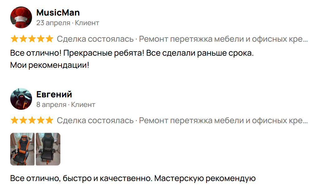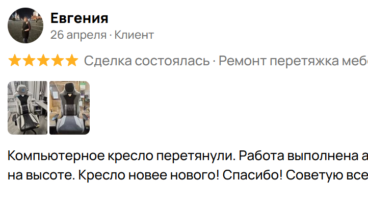 Мы — профессиональная мебельная мастерская, специализирующаяся на ремонте мебели любой сложности. Наша команда выполняет качественную перетяжку офисных, компьютерных и игровых кресел любым материалом на ваш выбор.