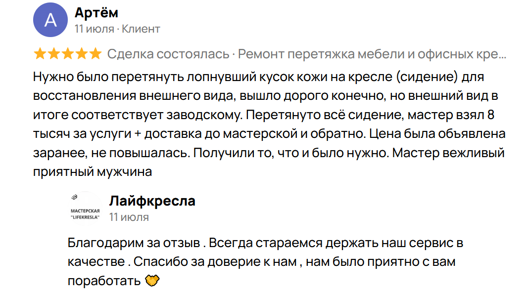 Перетяжка кресла руководителя | Натуральная кожа | 25000 руб. | +2500 руб. |